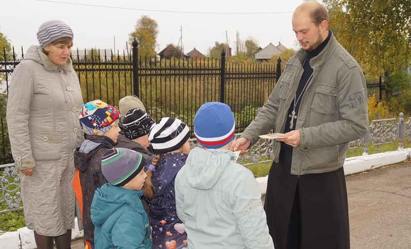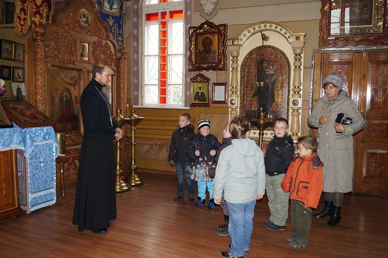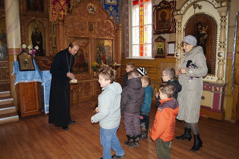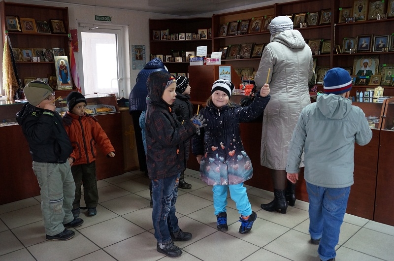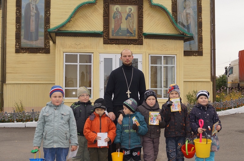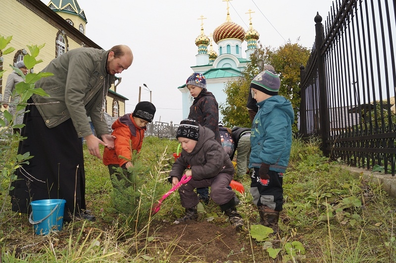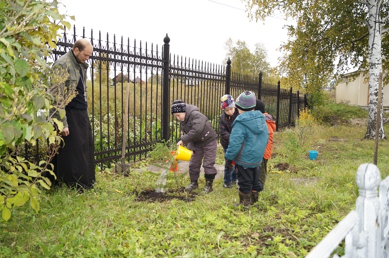 У ворот храмового комплекса ребят встретил штатный священник Петропавловского храма иерей Алексей Логинов. Вначале все зашли в свечную лавку для выбора восковых свечей, а затем направились в главный храм, в честь первоверховных апостолов, где им было рассказано о событии рождества Пресвятой Богородицы. Помолившись, все направились во двор, чтобы посадить молодые елочки в честь дня рождения Богоматери. Ребята с интересом и удовольствием трудились над посадкой, никто не остался без дела, всем удалось принять участие. В завершении посадки, о. Алексей подарил каждому маленькому гостю «Евангелие для детей» и все прошли на общее фото.