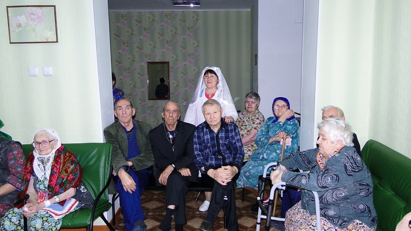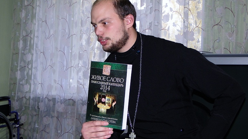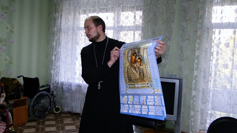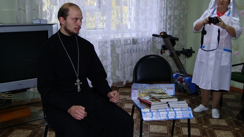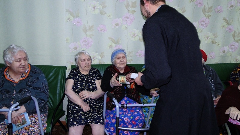 Иерей Алексей Логинов провел беседу на необычную тему «Старость, как благословение Божие». Кроме того, в связи с праздником преподнёс подарки от Петропавловского храма. На каждый этаж учреждения по настенному календарю и каждому жителю по иконке Пресвятой Богородицы «Феодороская». Помимо этого был пополнен фонд православной библиотеки книгами - календарями на 2014 год, с различными тематическими комментариями: Евангельские чтения на каждый день, чудотворные иконы Пресвятой Богородицы, душеполезные чтения на каждый день, жития святых, проповеди и беседы свящ. Даниила Сысоева, притчи и литературный календарь.